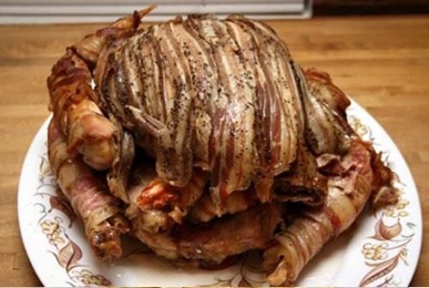 A chicken inside a duck inside a turkey, all wrapped in bacon